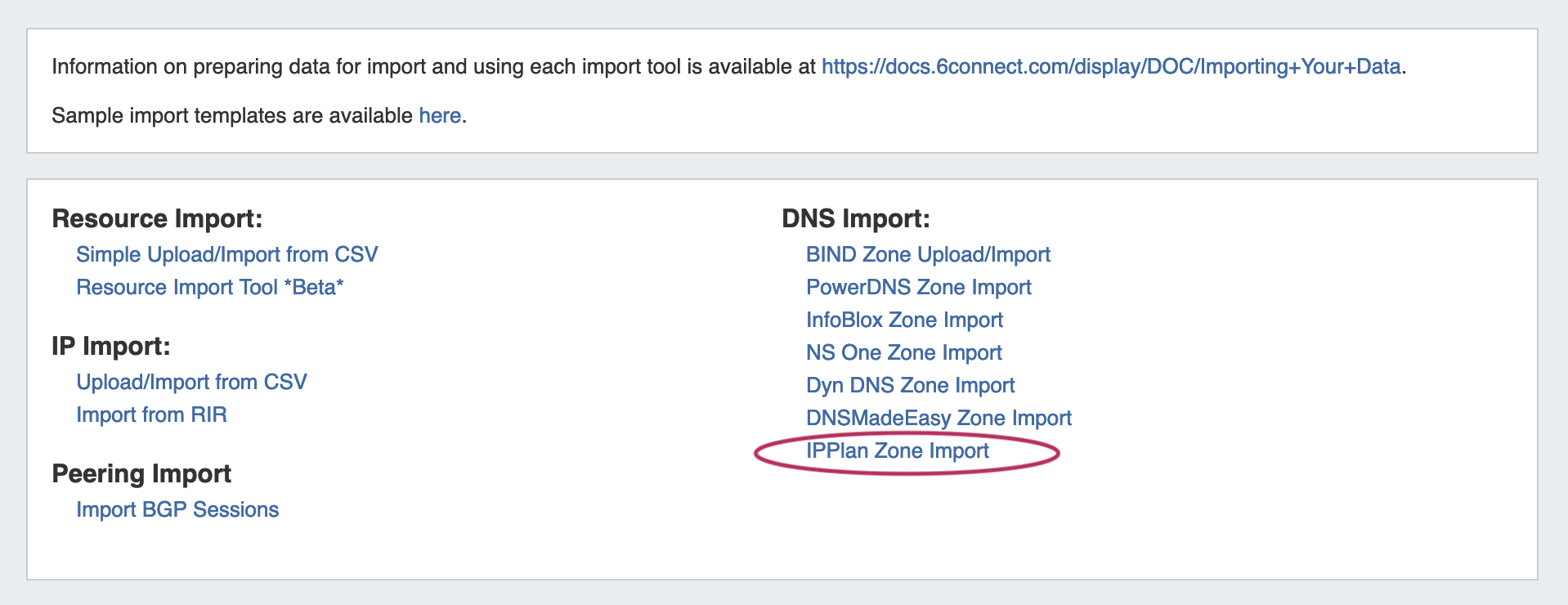 Once DNS Group setup has been verified, navigate to the Data Import Tab in the Admin section. Select the "IPPlan Zone Import" link.