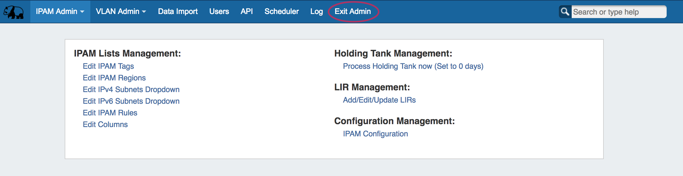 To leave the Admin area, simply click the "Exit Admin" link in the navigation bar. You will be redirected to the Dashboard.