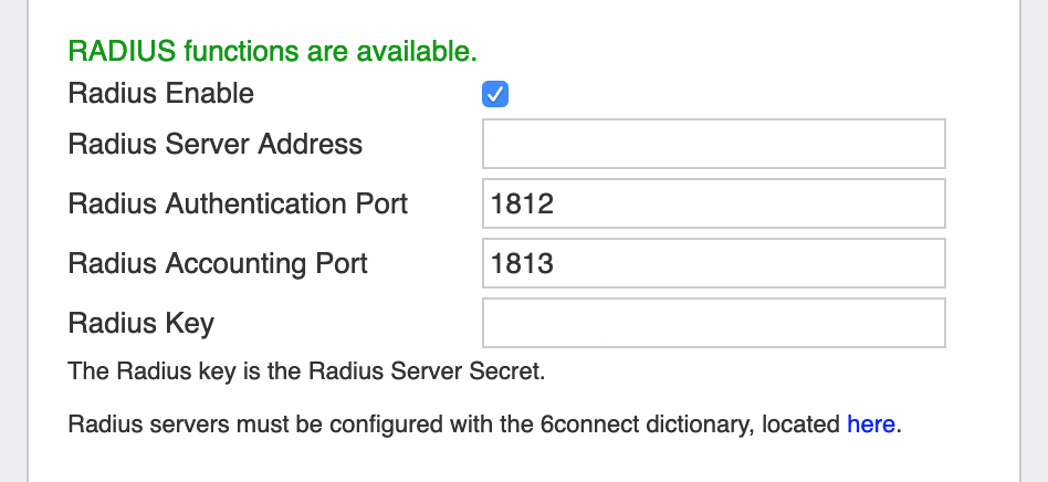 - Ensure that Radius functions are marked as available. Radius functions are always available on 6connect cloud instances. Radius functions are available on VM Images and Local Installations only if the relevant PHP Pear Radius Libraries have been installed.