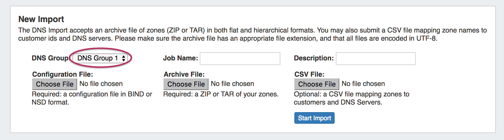 If zones are to be imported, a DNS Group may be selected during the import process to associate with the zones.