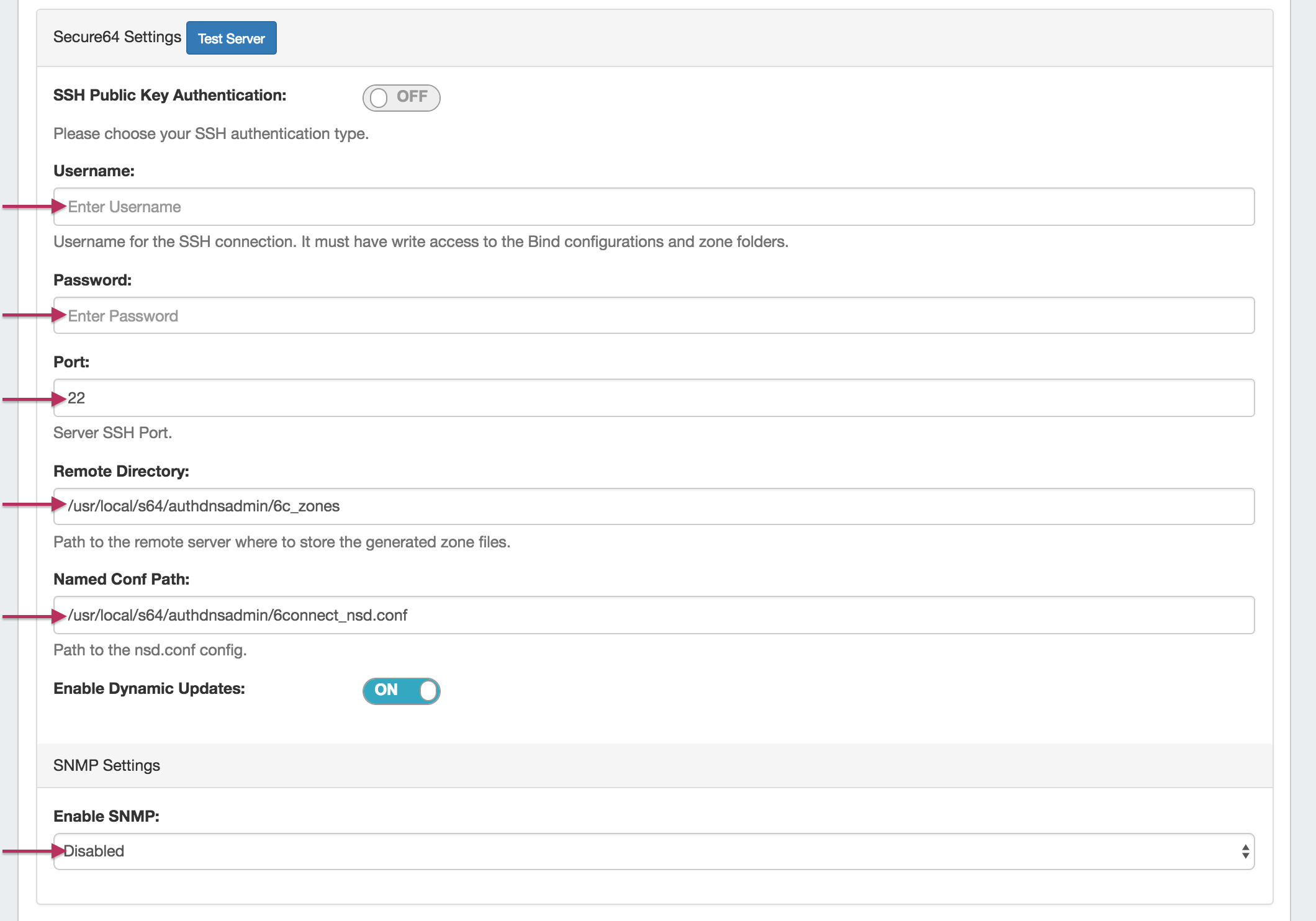 Enter the server Username, Password, Port, Remote Directory, Named Conf. Path, and whether to enabled SNMP.