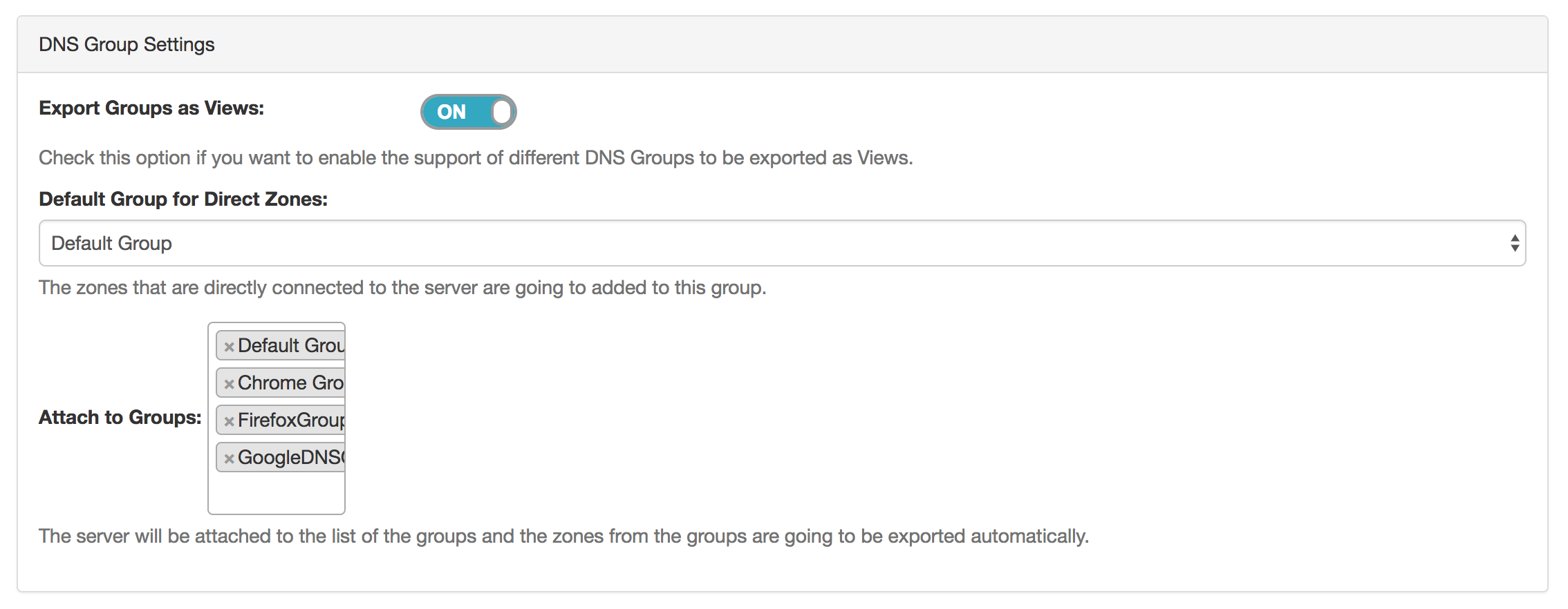 In DNSv3, Views may be created by selecting the "Export Groups as Views" toggle and selecting a DNS Group under the server details sections "DNS Group Settings".
