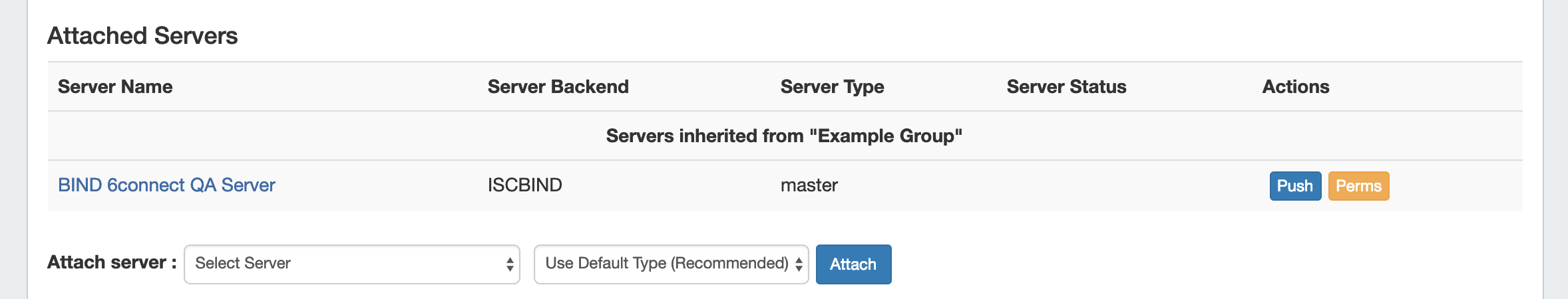 Additional servers may be attached by selecting the server name, type (default, master, slave), and clicking the "Attach" button, as long as the user has permissions on both the zone and the server to attach. After attached, users with sufficient permissions may detach, push, or edit permissions on the server.