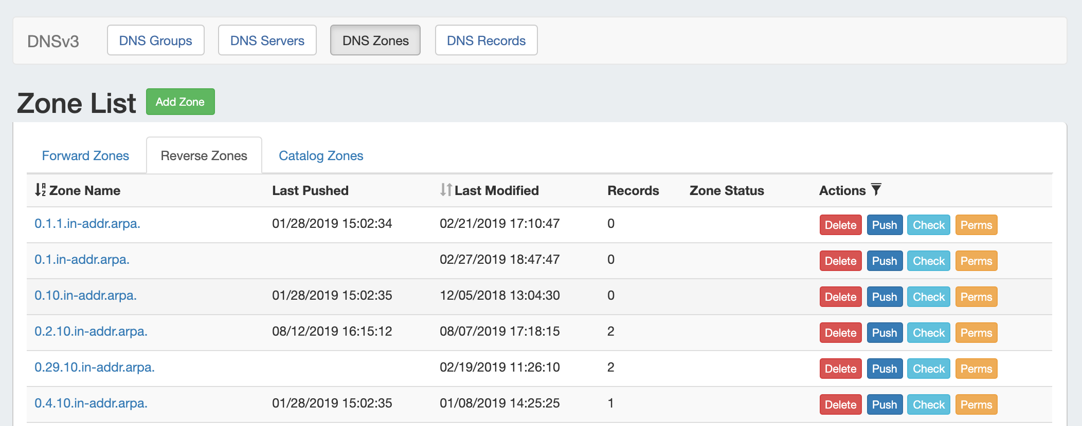 DNS Zones are accessed under the DNS tab, DNS Groups or DNS Zones sub-tabs. The DNS Zones sub-tab features the DNS Zone List - a straightforward list of all zones existing in ProVision, including those not attached to DNS Groups. From here, you can create a new zone, view all Forward, Reverse, and Catalog zones, delete, push, check, view pending approvals, or edit permissions (admin only) on a zone.