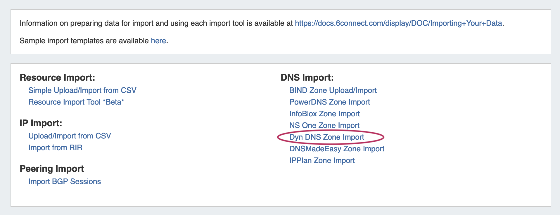 Once server setup has been verified, navigate to the Data Import Tab in the Admin section. Select the "Dyn DNS Zone Import" link.