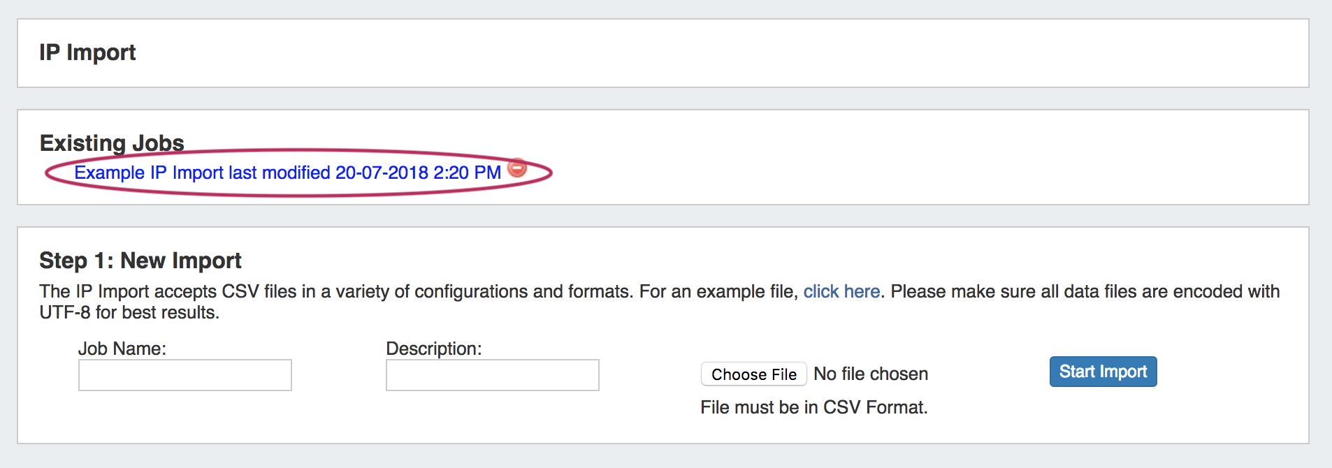 If the IP Import was fully successful, and you do not wish to retain the job data, the Import Job may be deleted from the "Existing Jobs" list by clicking the delete icon next to the job name.