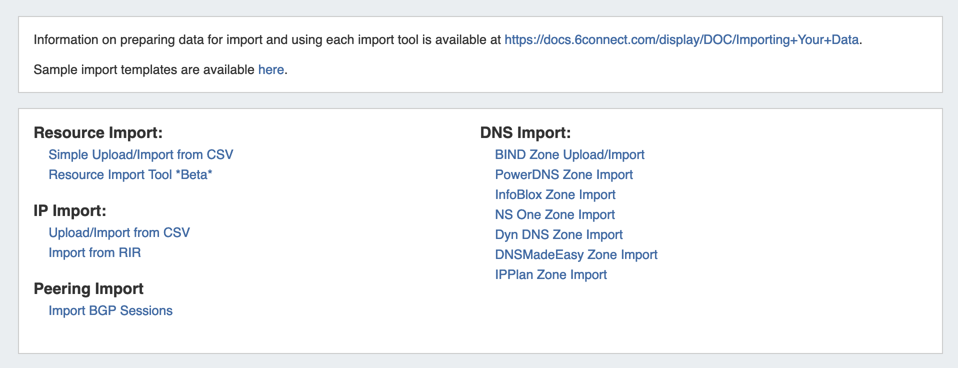 If your import includes a large number of small blocks (/30s, /32s), be sure you've included at least one large block which encompasses them (/24, /22). This will ensure that the smaller blocks are neatly organized under the larger block, rather than imported as their own Top-Level Aggregates.