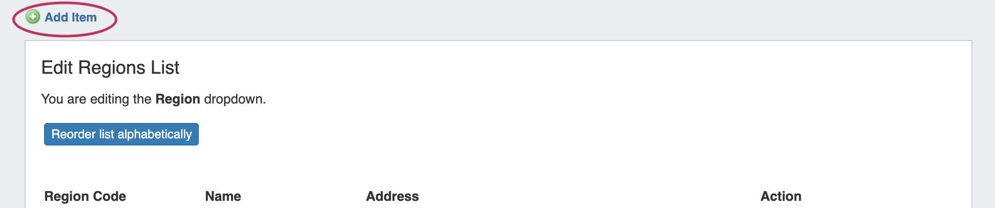 To add a new Region item, click the "Add Item" link at the top of the screen.