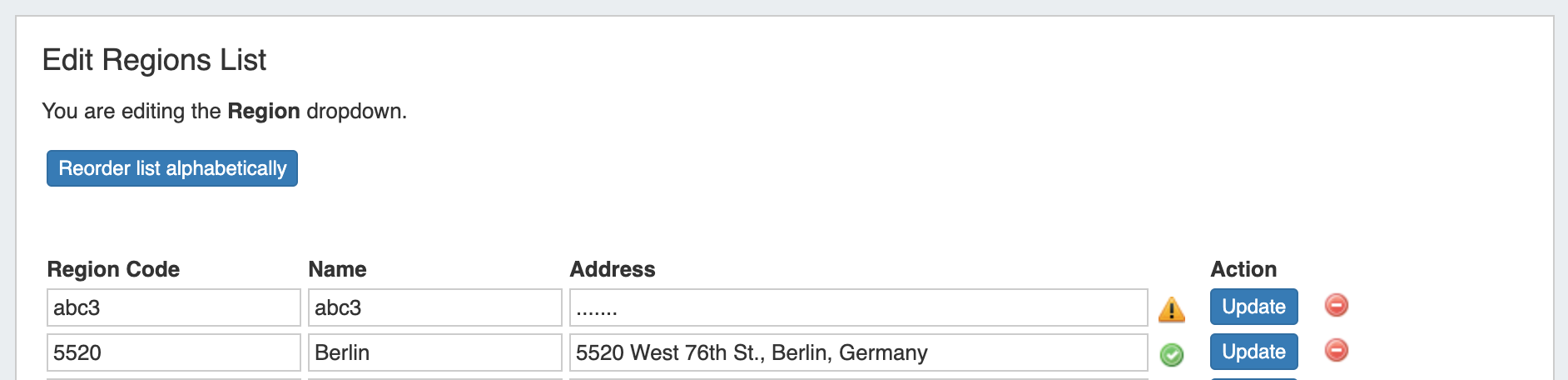 To reorder the regions list, click on the "Reorder list alphabetically" button.