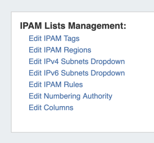 Through this area, admin users can update IPAM tags, IPAM Regions, IPv4 / IPv6 subnets, IPAM Rules, Numbering Authority, and IPAM Columns.