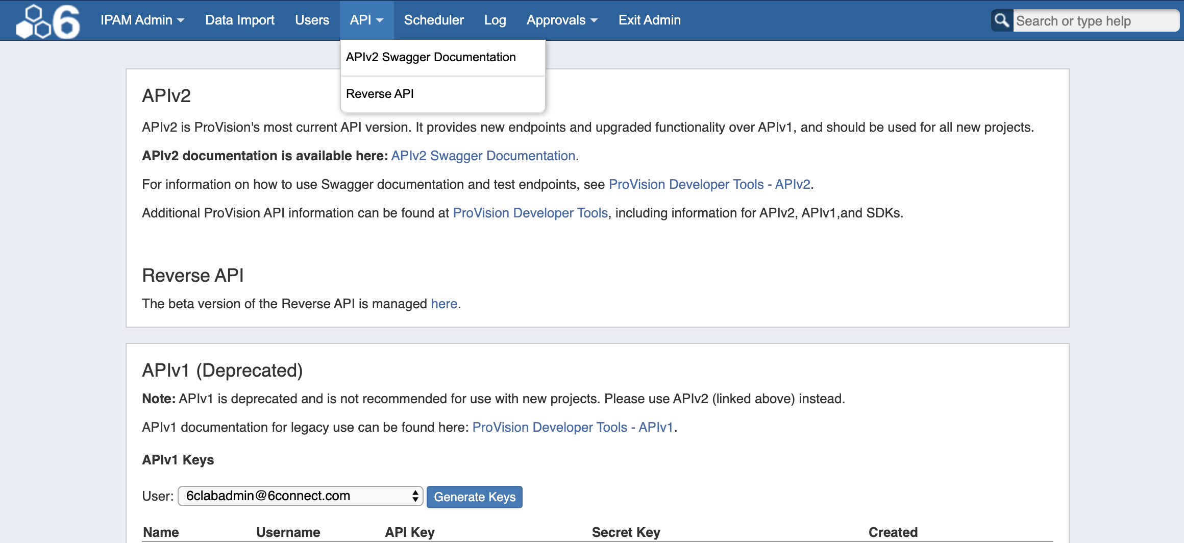The API tab provides links to APIv1 / APIv2 documentation and beta Reverse API management. It also allows you to create and manage APIv1 keys for users.