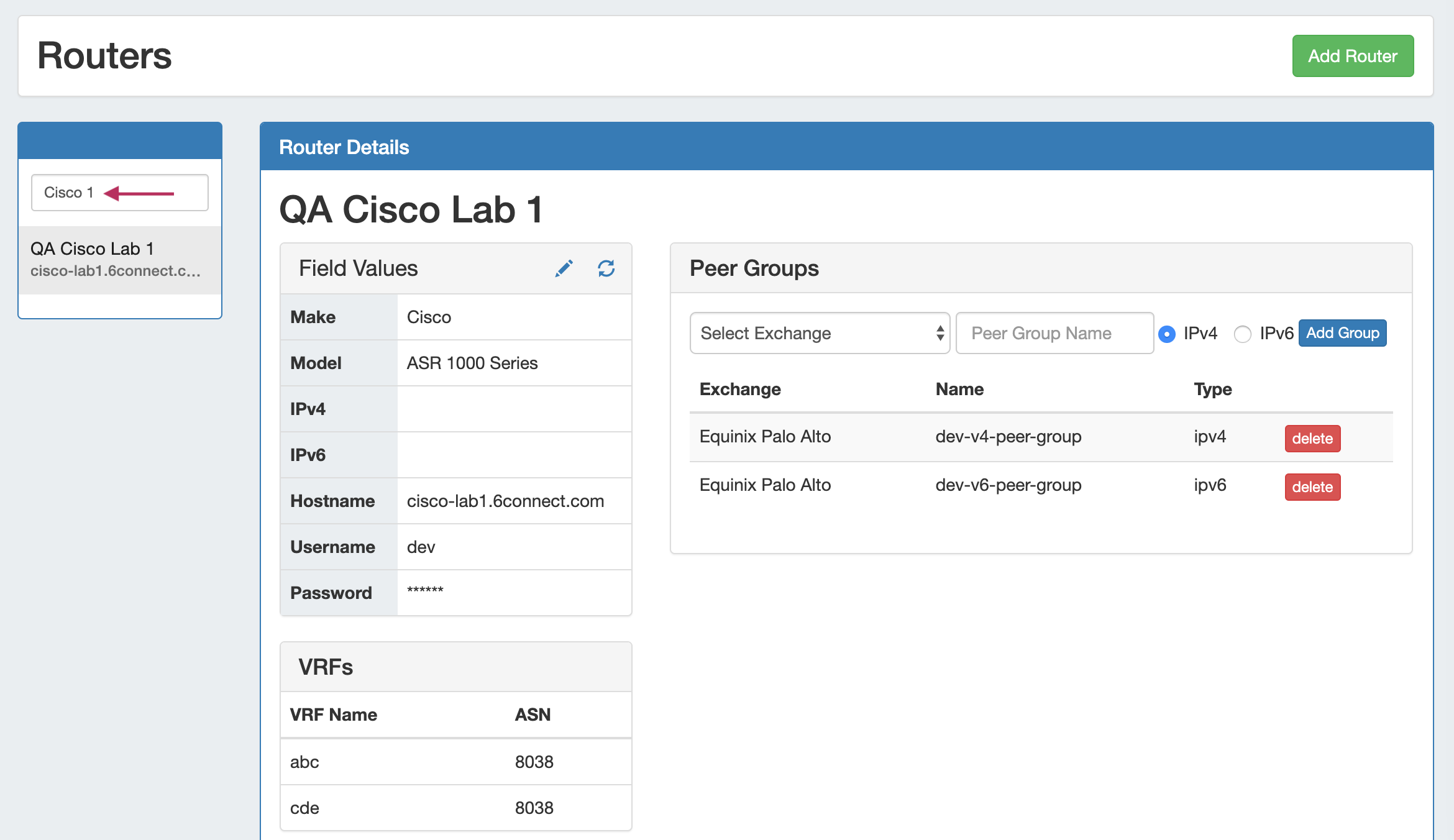 A Router's Make, Model, IP address, Hostname, Username, and Password may be edited from the Peering Router Details page.