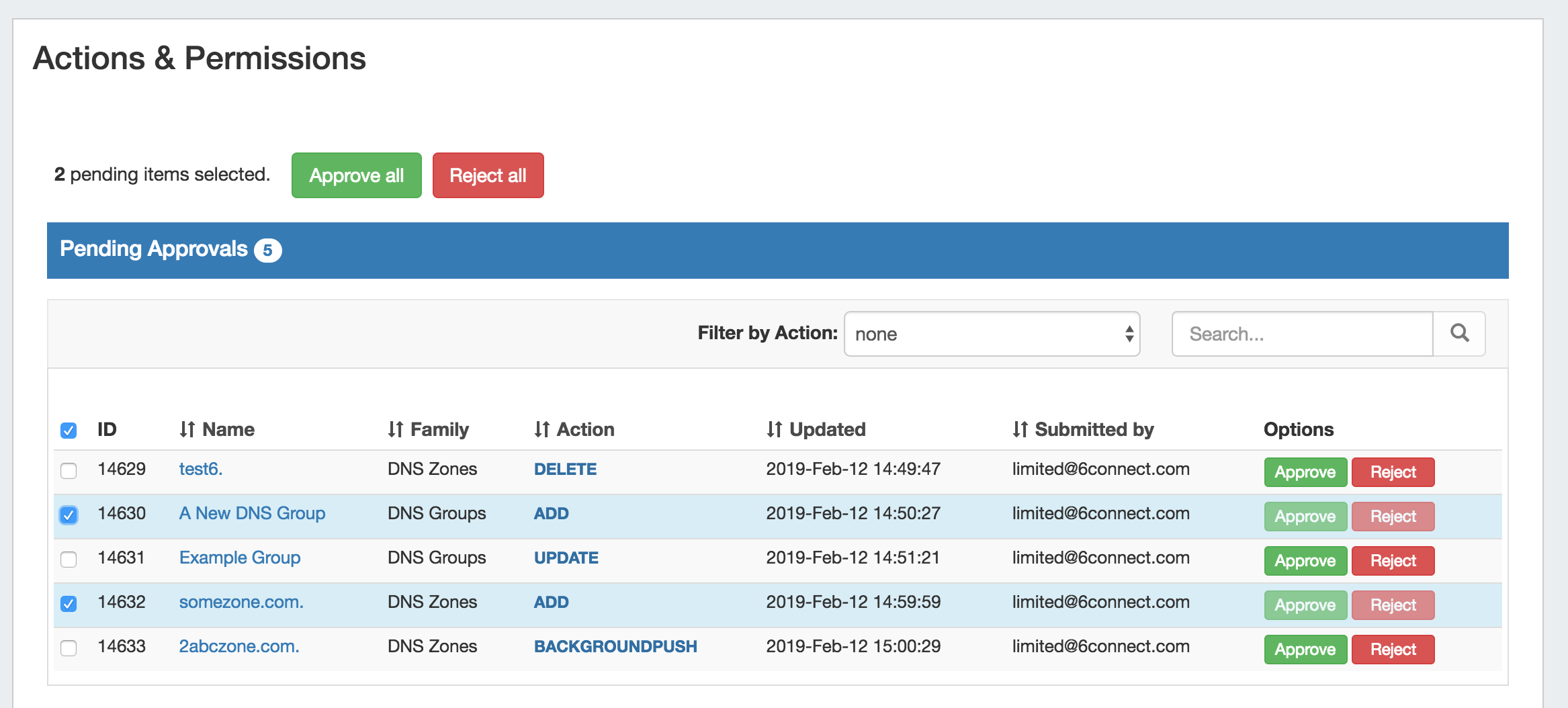 1. Submitter makes an action (either by action type or DNS Family) that requires approval