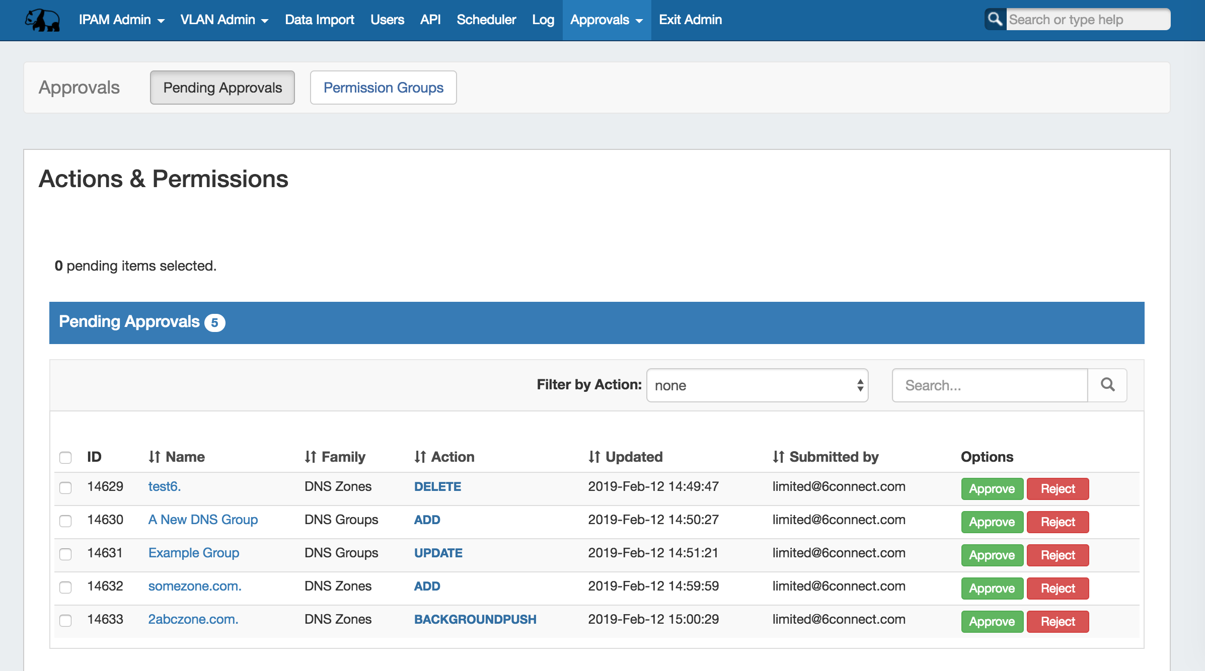 4. The Approver reviews the change in either their Approvals Tab Pending Approvals list, or the DNSResources Awaiting Approval module, and chooses to Approve or Reject the change: