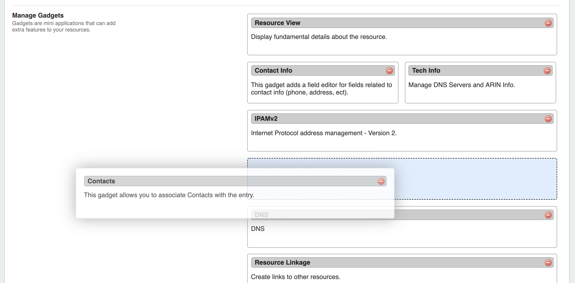 You will notice on this customization screen that you also have an area for (7.4.0-7.4.6) Gadgets. Gadgets are modules of additional functionality that can be added to the UI of a given Resource. Simply select the Gadget you want to show for that section, hit "Add".