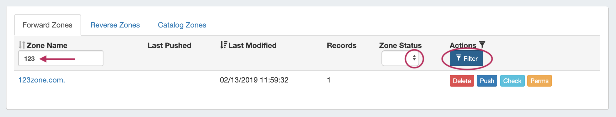 Then, type in all or part of the zone name, or select zone status. Click "Filter."