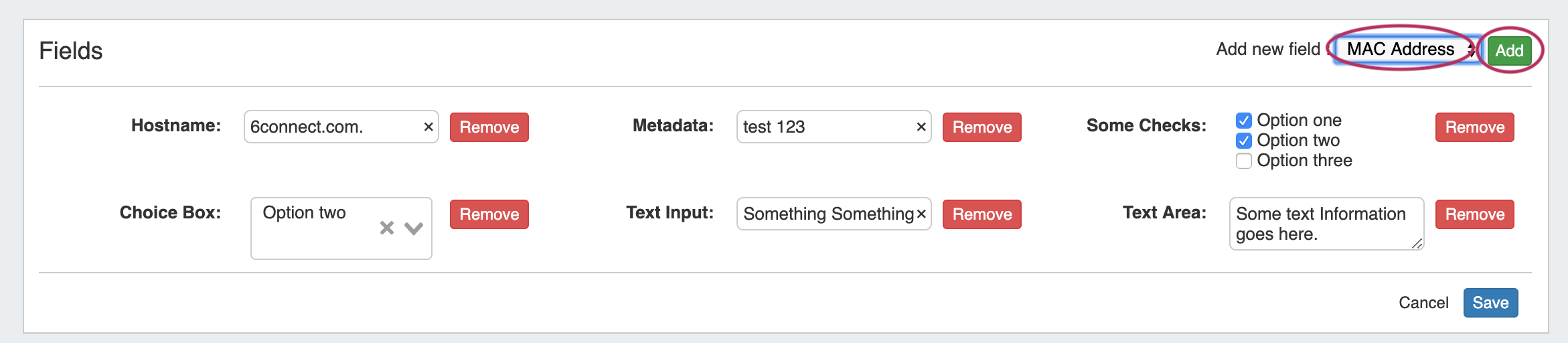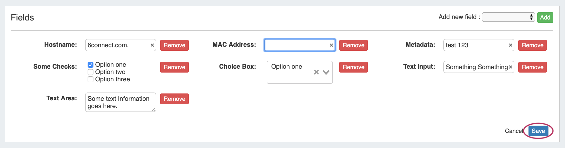 Once added, the field will be available to edit or remove. Edit field value(s) as desired, then click "Save".