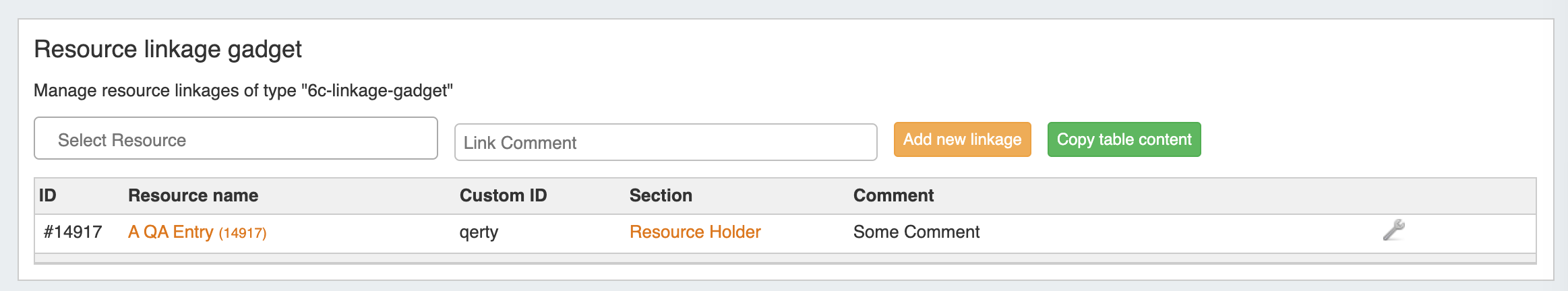 To use the Resource Linkage Gadget, first, ensure that "Resource Linkage" is enabled under "Manage Gadgets" for the Section type of the Resource being used.