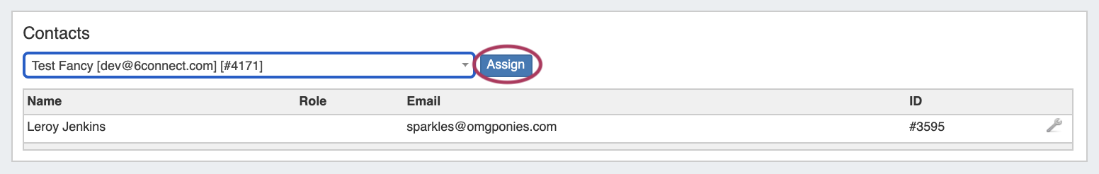 To assign a contact, search for and select the desired contact in the search box, then click "Assign". The Contact will show in the list below.
