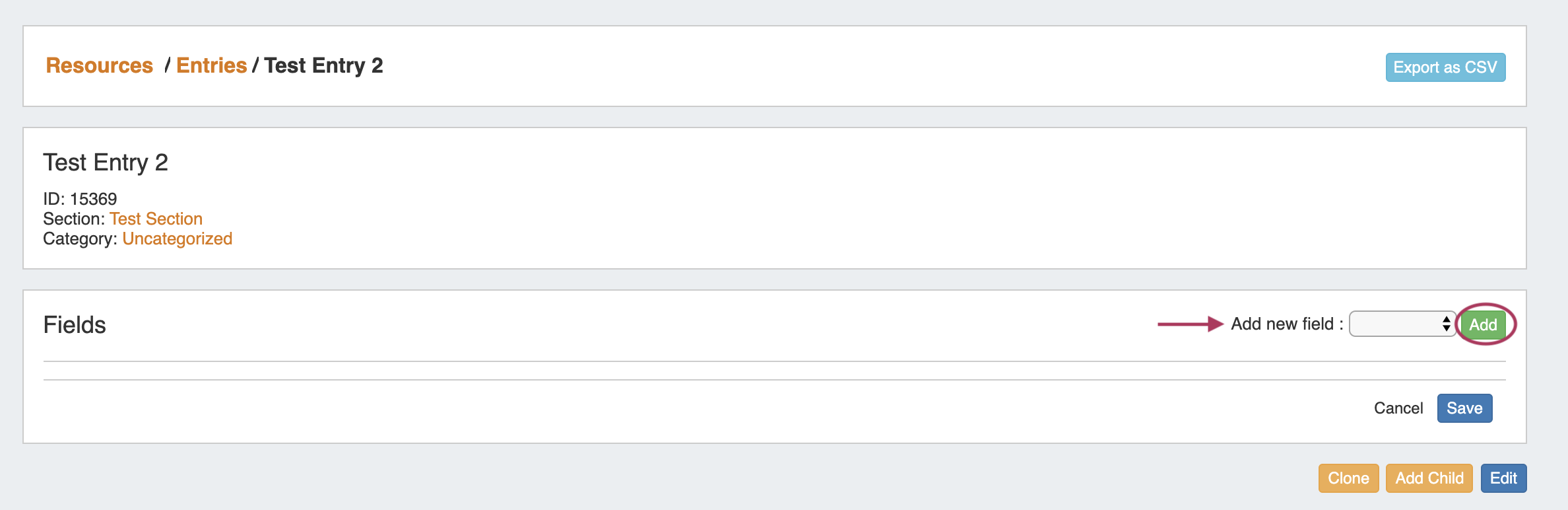 Once the Field Gadget has been added, and fields have been enabled for a Section, the Field Gadget will display on the Resource Entry page for a resource of that section.