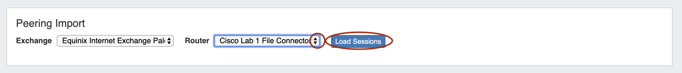 First, select the desired exchange and router. Routers with Logical Systems information will show up as the router name with the Logical System info in parenthesis (e.g. "Juniper (test)"). Then click "Load Sessions".