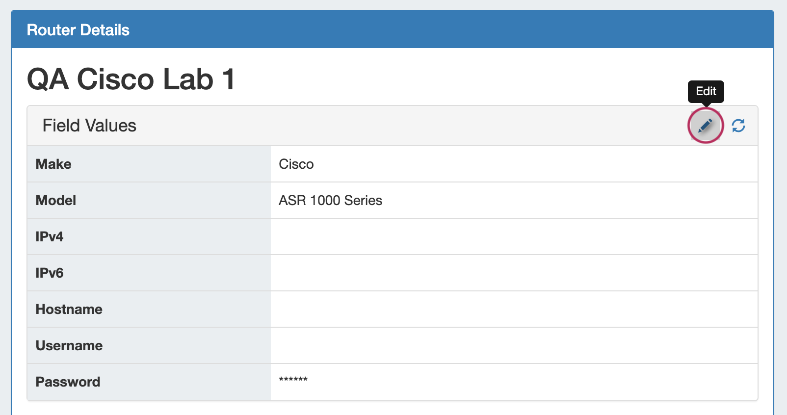 To edit a router field, click the "Edit" icon (pencil), and input the desired change.