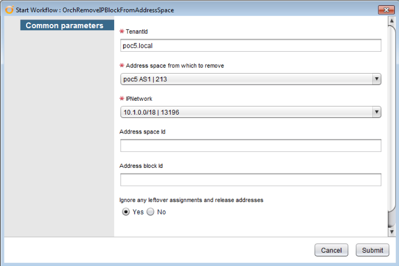 - Ignore any leftover assignments and release addresses: If set to Yes, any assigned IP addresses are unassigned before removing address space. If set to No and there are still IP addresses assigned (apart from network address, broadcast address and gateway), the workflow throws an error