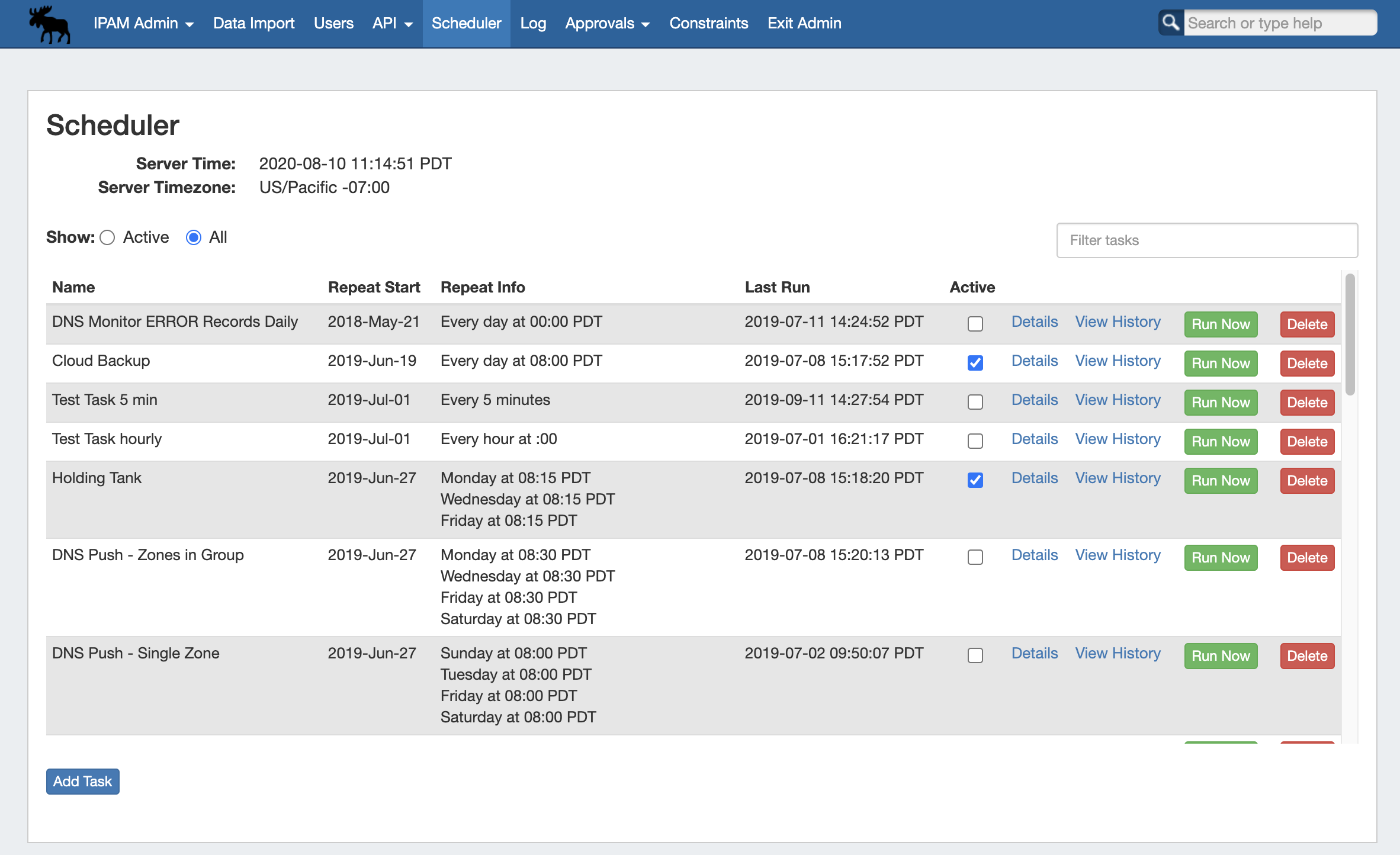From the task list itself, you can enable/disable tasks, view details, view history, run tasks, and delete tasks.