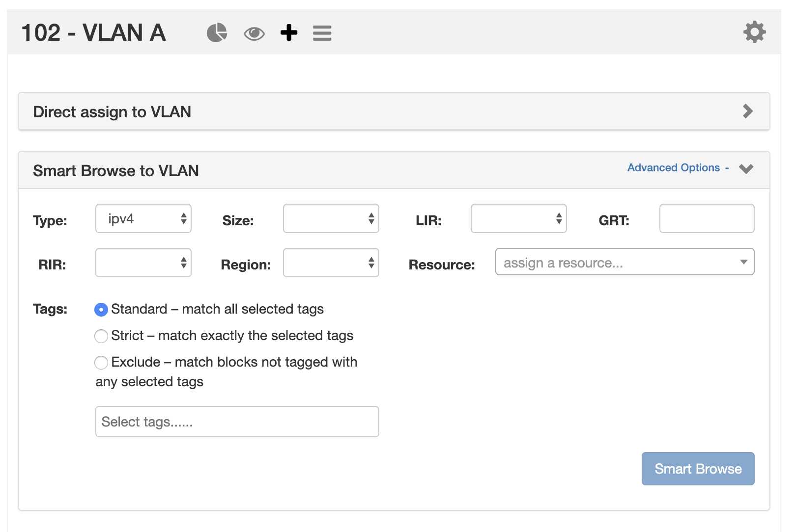 To open either option, click on the appropriate header bar to expand the module. Expand the area below for more details on Direct Assign to VLAN and Smart Browse to VLAN:
