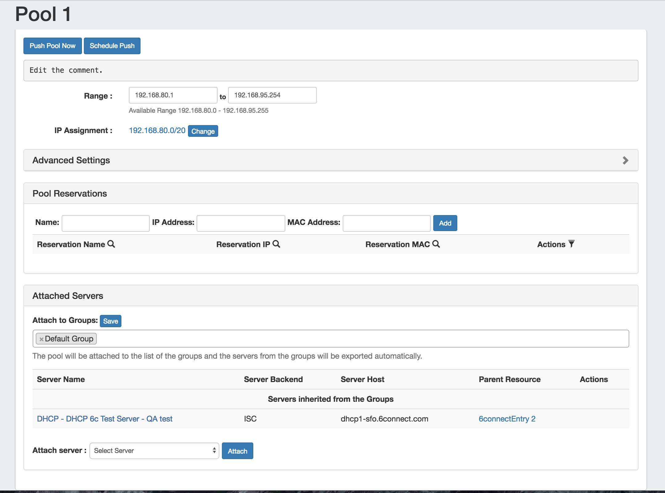 Before pushing a pool for the first time, view the "Attached Servers" section in the Pool Details page and verify that the correct server is attached to the DHCP Pool, either directly or via a DHCP Group.