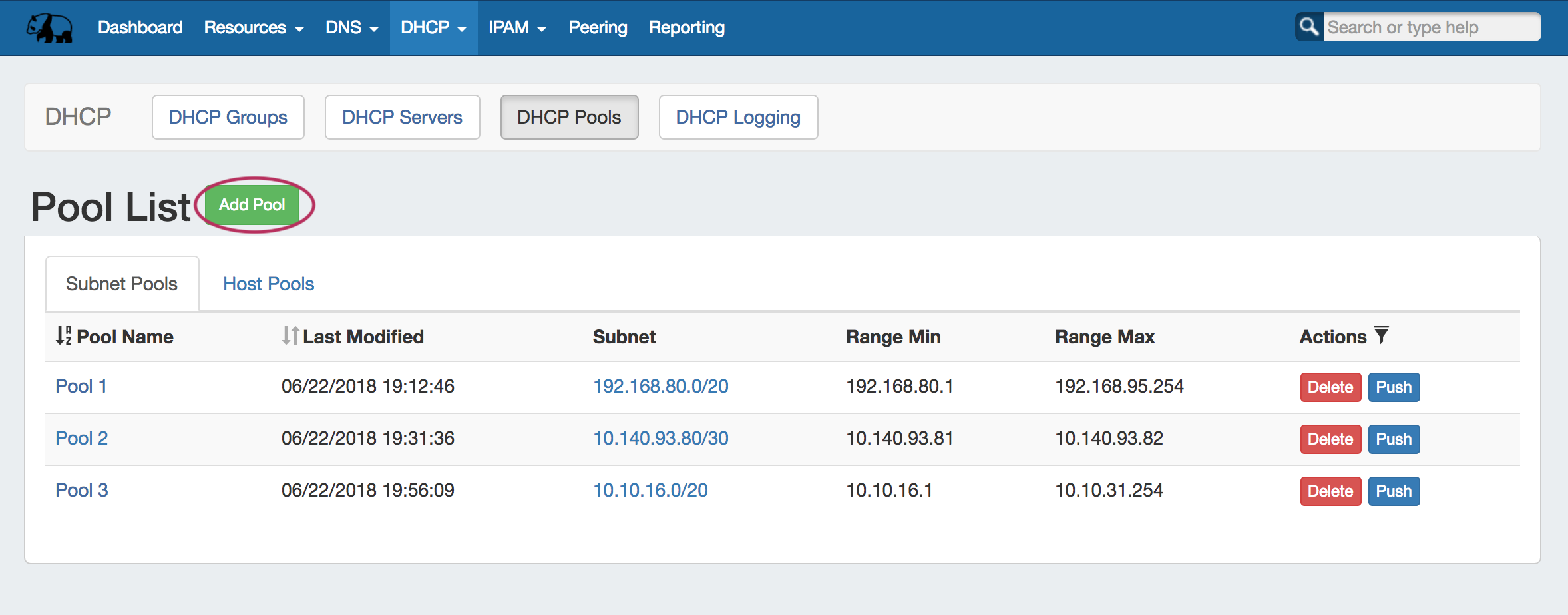 Pools may be manually pushed by clicking the "Push" button for the pool from any DHCP Pools list.