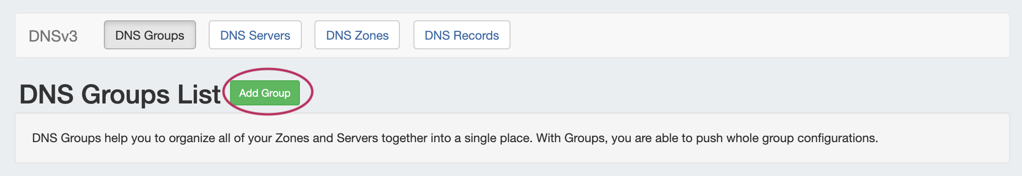 To create a new Group, from the DNS Tab, select the DNS Groups sub menu. Then, click the "Add Group" button next to "DNS Groups List".