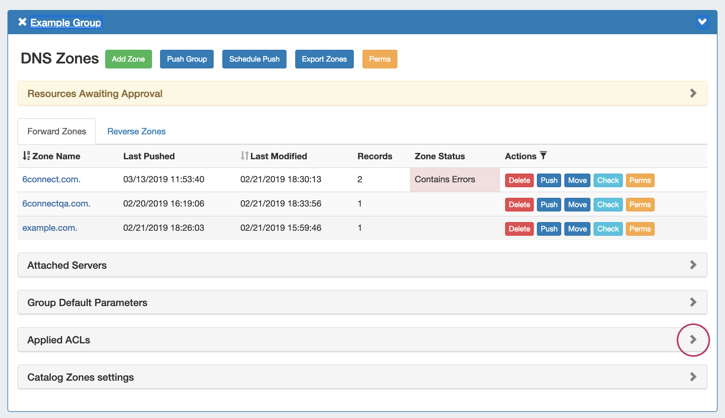 ACLs may be edited similarly to how they are created. Click the "Add or Edit ACL" button under the "Applied ACLs" module for the DNS Group.