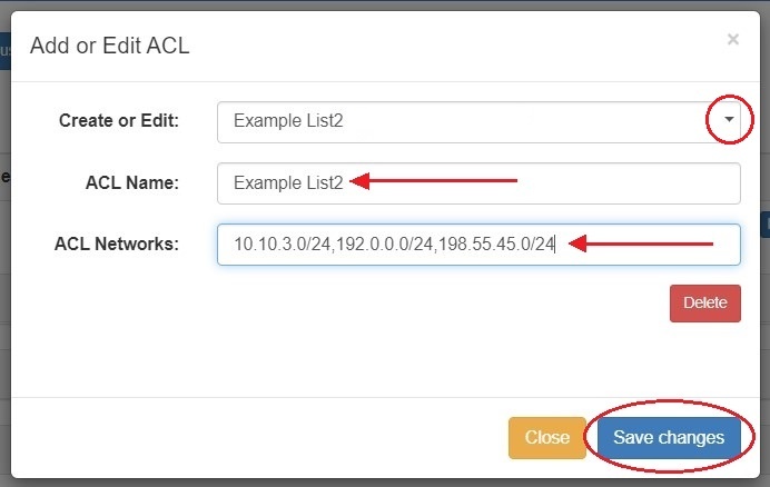 Select the ACL you wish to edit from the "Create or Edit" selector. Then, edit the Name or Network fields as desired.