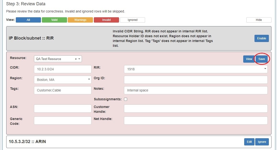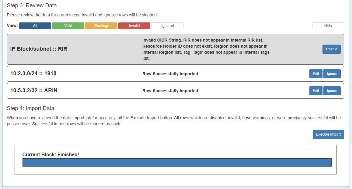- If the IP Import was only partially successful or requires additional review, you may keep the import job in the "Existing Jobs" list and revise the failed / invalid blocks at a later time. Re-running the import from the same job will allow you to re-attempt import on only the previously unsuccessful / ignored / edited blocks - successfully imported and unchanged blocks will not be affected.