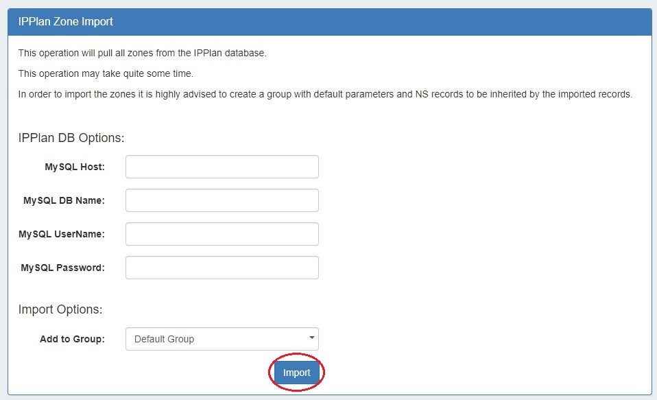 The ProVision "IPPlan Import" option imports IPPlan zones using provided MySQL database credentials. It is advised to create a DNS Group prior to the import with default parameters and NS records to be inherited by the imported records.