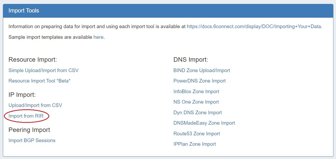 From the Data Import Tab, select "Import from RIR" under "IP Import".