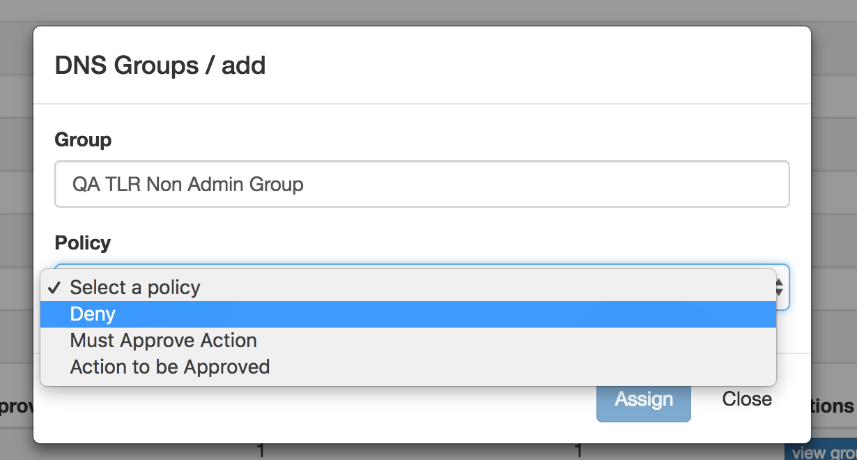Clicking the "Assign" button for a group brings up a checklist to select one or more actions to apply a policy to for that Group.