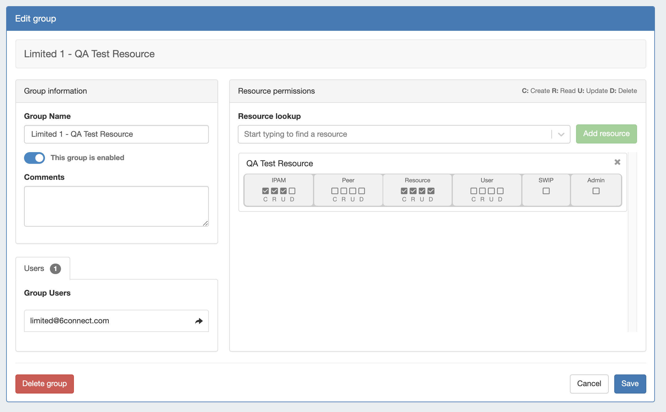 Resources & Access: Inside a Group, Resource access may be set to Global TLR (applies to all Resources), or to the specific Resource level (applies to only the selected Resources). For each Resource selected, access permissions can be set with C/R/U/D permissions under each ProVision module area (IPAM, DNS, Resource, Peering).