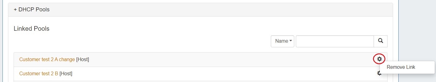 Both Linked and Existing DHCP pools have field-specific search options to filter the DHCP pool list(s). Select the search term type from the dropdown list, type the search term in the search box, then hit the "Search" icon.
