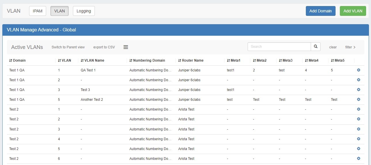 From this page, you may add domains or VLANs, edit a domain (by clicking the "List" icon), export the list, and perform various actions from the VLAN Action Menu (right click on a VLAN entry).
