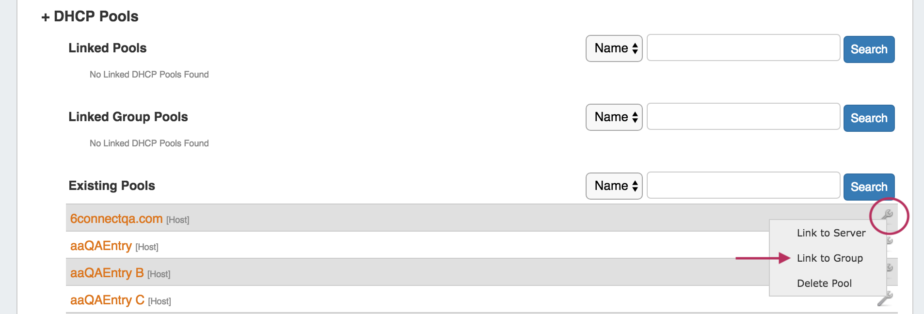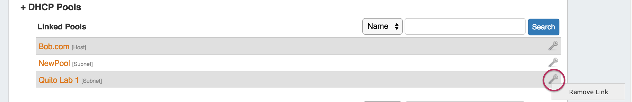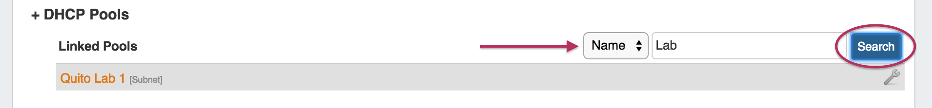 Both Linked and Existing DHCP pools have field-specific search options to filter the DHCP pool list(s). Select the search term type from the dropdown list, type the search term in the search box, then hit "Search".