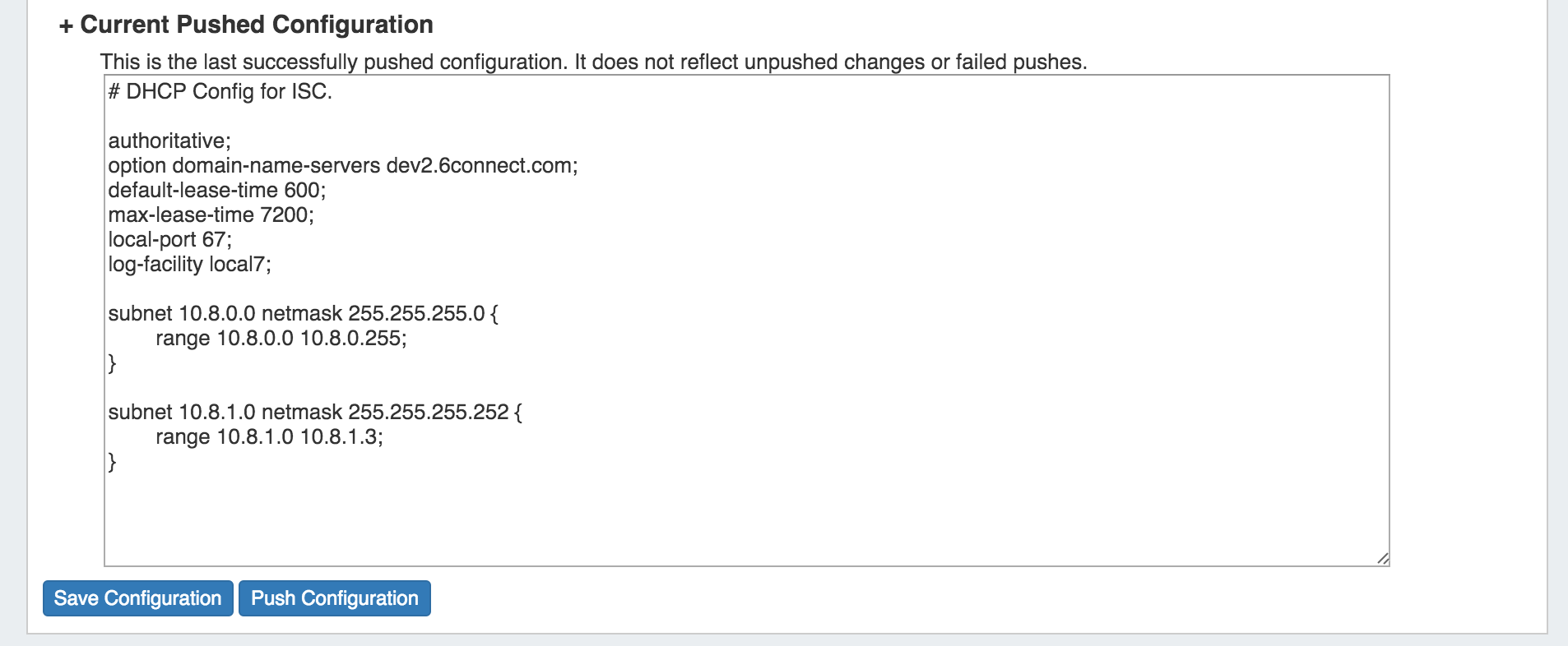 Expanding "Current Pushed Configuration" allows you to view the detailed text (read-only) of the last sucessfully pushed configuration.