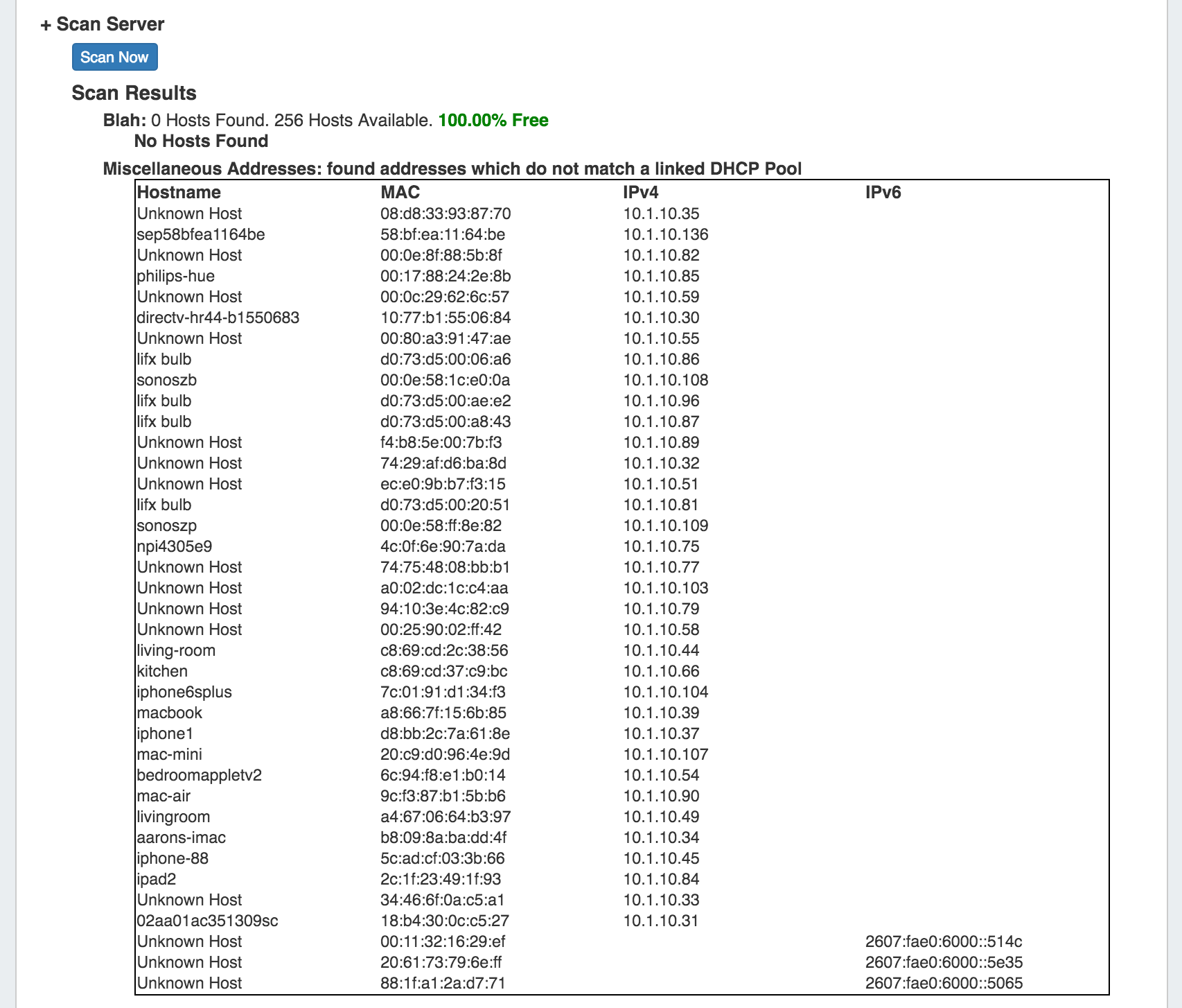 Scan Server provides a "Scan Now" button, which scans the DHCP server and returns found IPs under DHCP Pools.