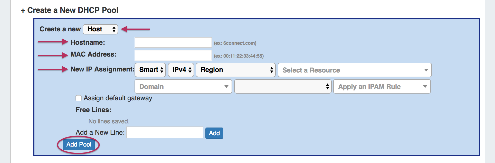 - Have, or set up IPAM Aggregates with subassignable blocks from the IPAM Tab with the desired IP space type, RIR, Region(s), Tags, and any desired VLAN criteria. Regions are a required field when assigning IPs from the DHCP Customer Configuration Gadget.
