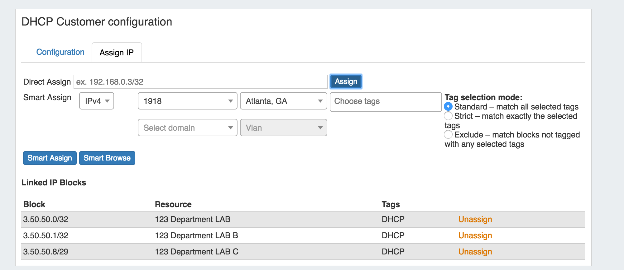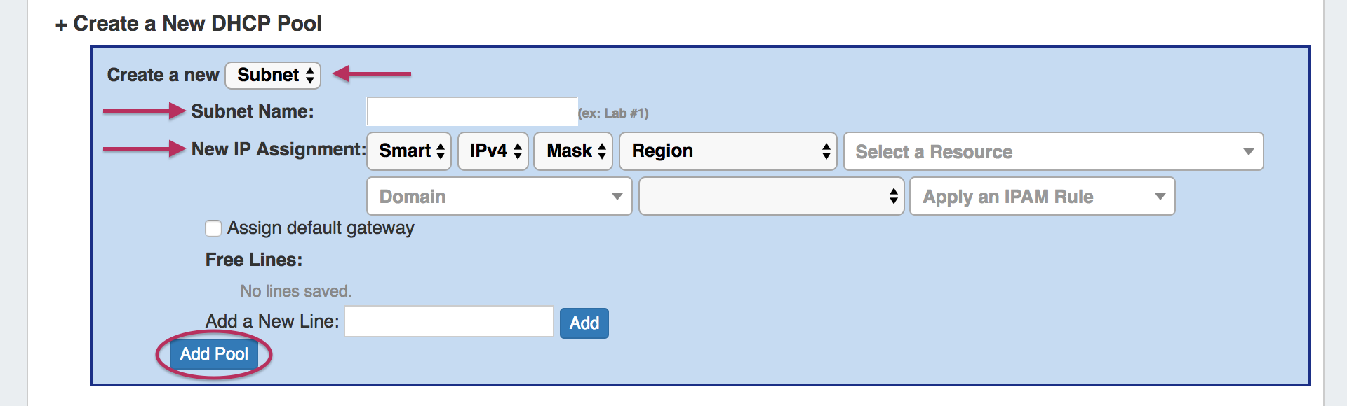 When Assigning a Subnet (via dropdown) the IP Assignment selection will pull the data from any IPAM block meeting your defined criteria. You can use either a Smart or Direct assignment depending on your preference. For Smart Assign pool creation, existing IP Rules may be applied to reserve additional addresses out of the pool range. To create an IP Rule, see IPAM Rules.