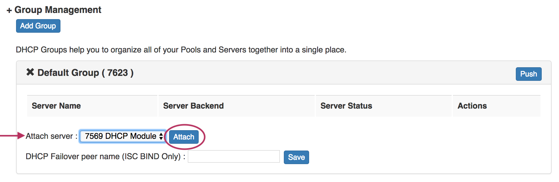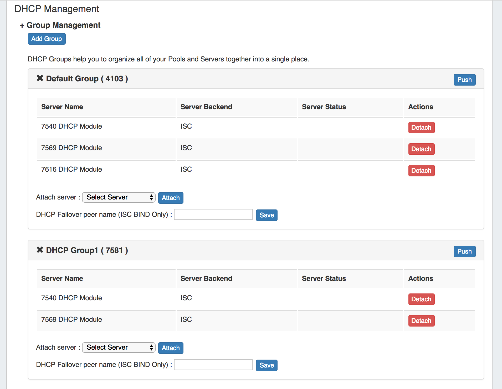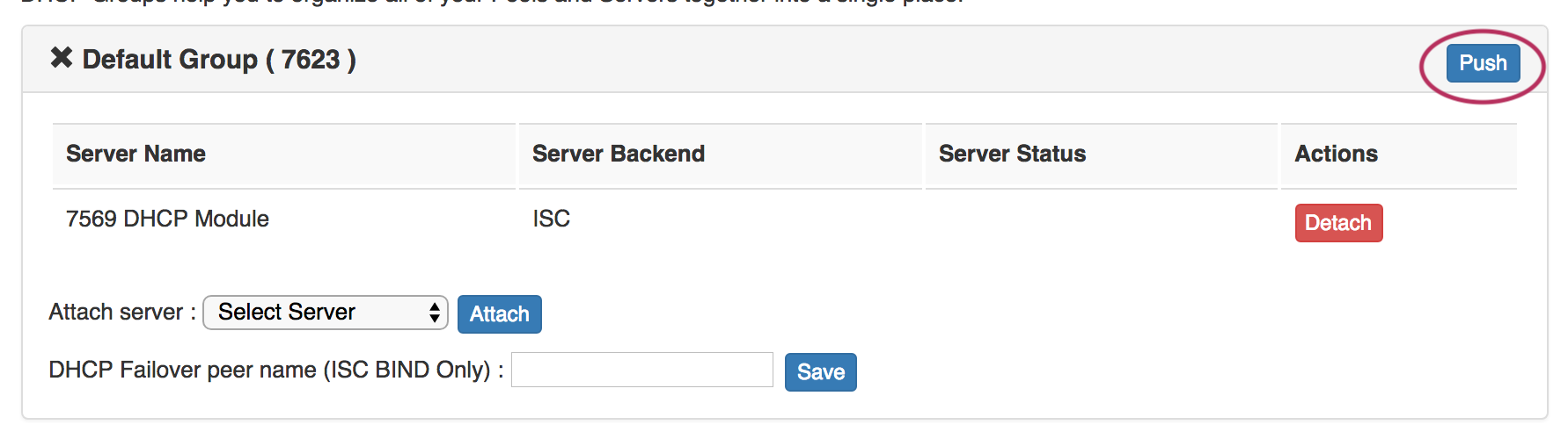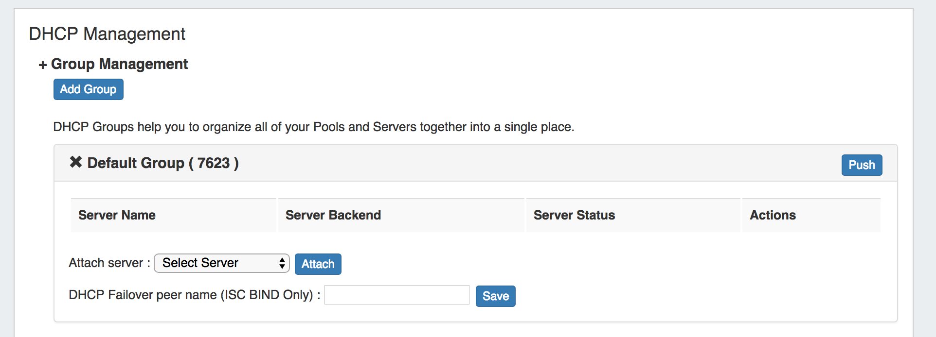 DHCP groups help you to organize all of your Pools and Servers together into a single place, and push pools linked to a DHCP Group to all of the servers attached to that Group. It also allows for the designation of a DHCP Failover Peer for ISC BIND servers.