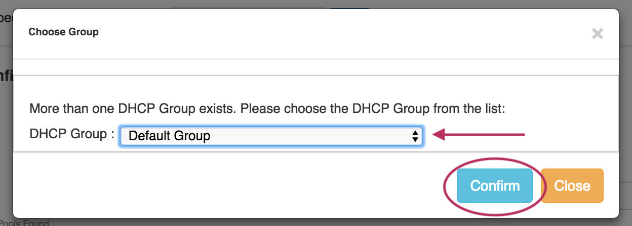 From the Existing Pools list under the DHCP Pools section, click the Action Menu for the pool you wish to link to a DHCP Group. From there, click "Link to Group". If multiple DHCP Groups exist, a dialog will pop up for you to select the desired Group to link the pool to. Select the DHCP Group, then click "Confirm" to add the pool to the Group. Once linked, the DHCP Pool will show under the "Linked Group Pools" area of the DHCP Pool section. From here, if desired, you may remove the pool from the group by clicking the Action Menu and "Remove Link". |