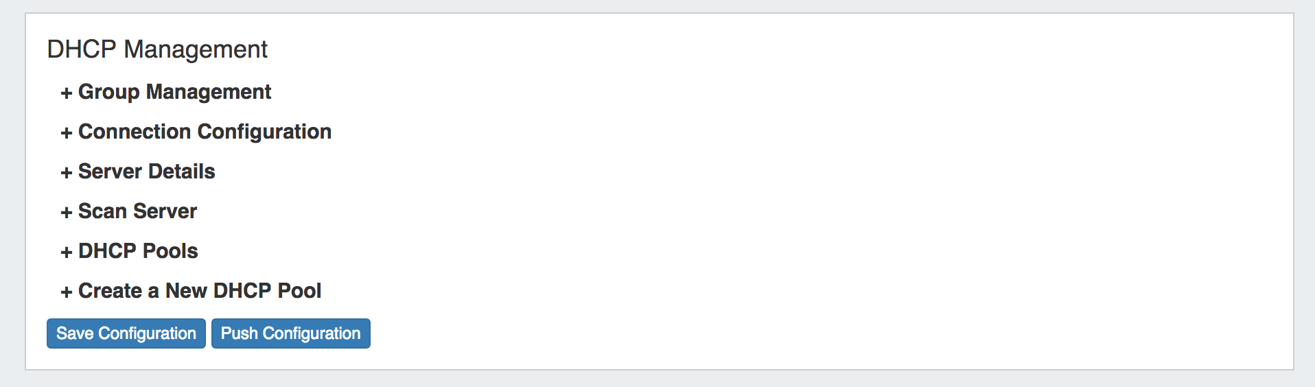 Once enabled, the DHCP Management Gadget will show sections for "Group Management", "Connection Configuration", "Server Details", "Scan Server", "DHCP Pools", and "Create a New DHCP Pool". Once pushes or unpushed configuration changes occur, a "Current Pushed Configuration" or "Unpushed Configuration" section will be available for review.
