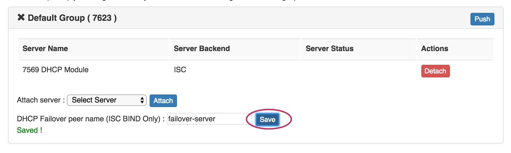 If a DHCP failover peer is configured for the server, enter the server name and click the "Save" button. In the event that the primary server fails to push, the push will be sent to the failover peer instead. |